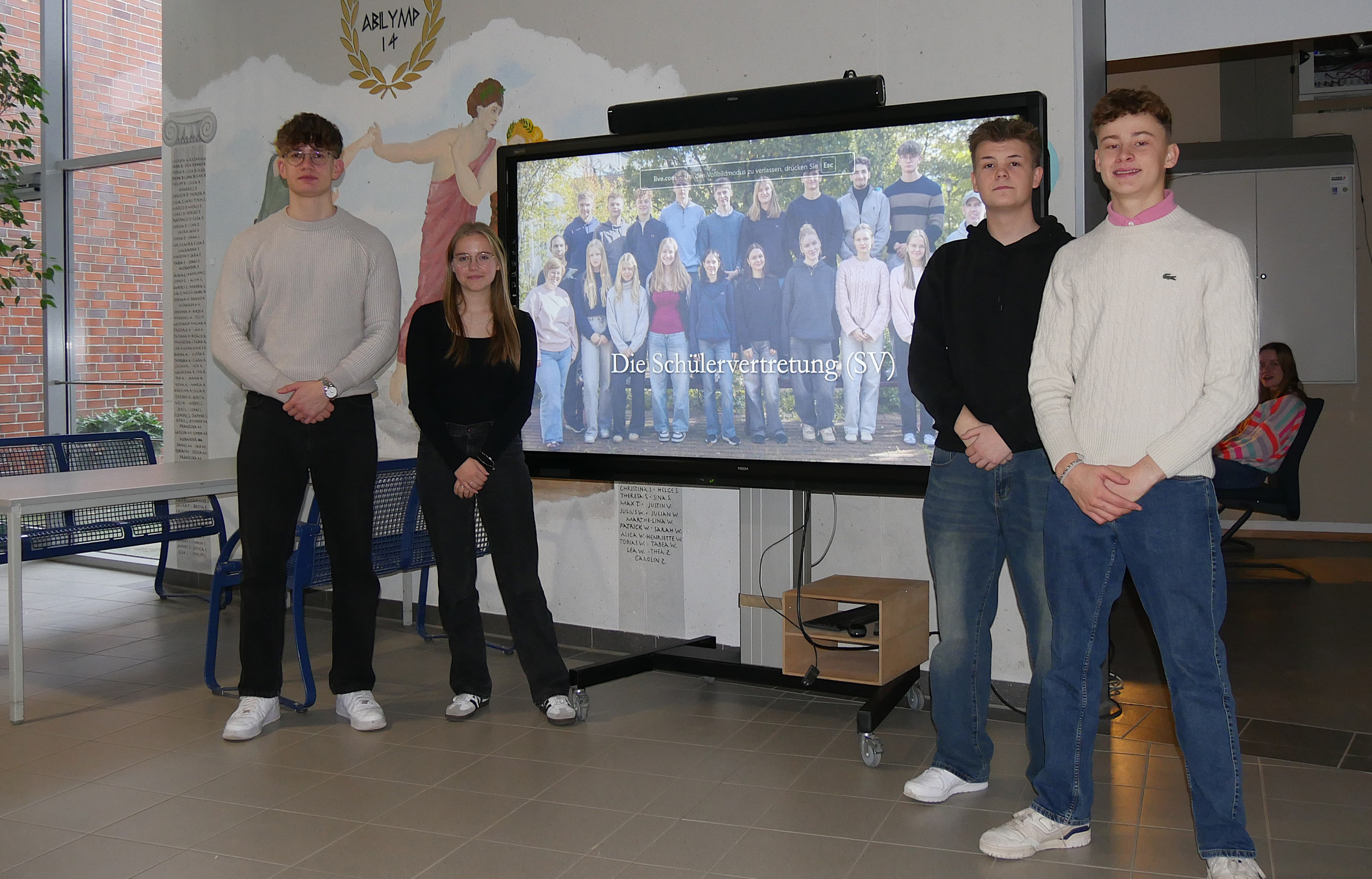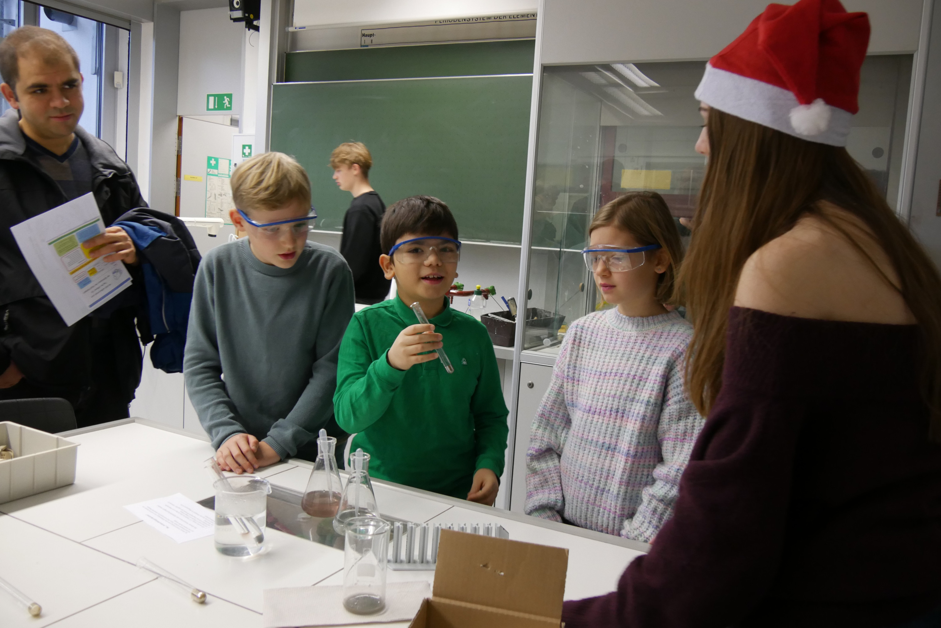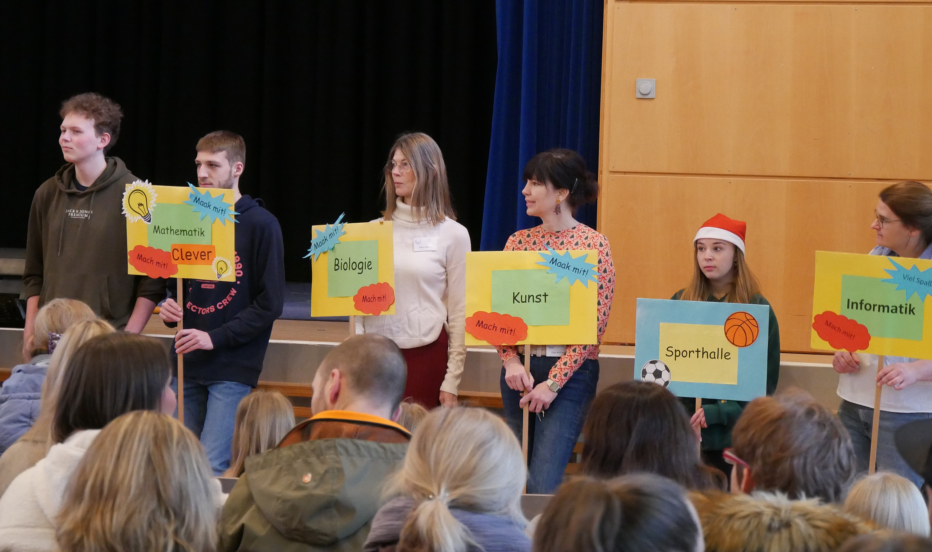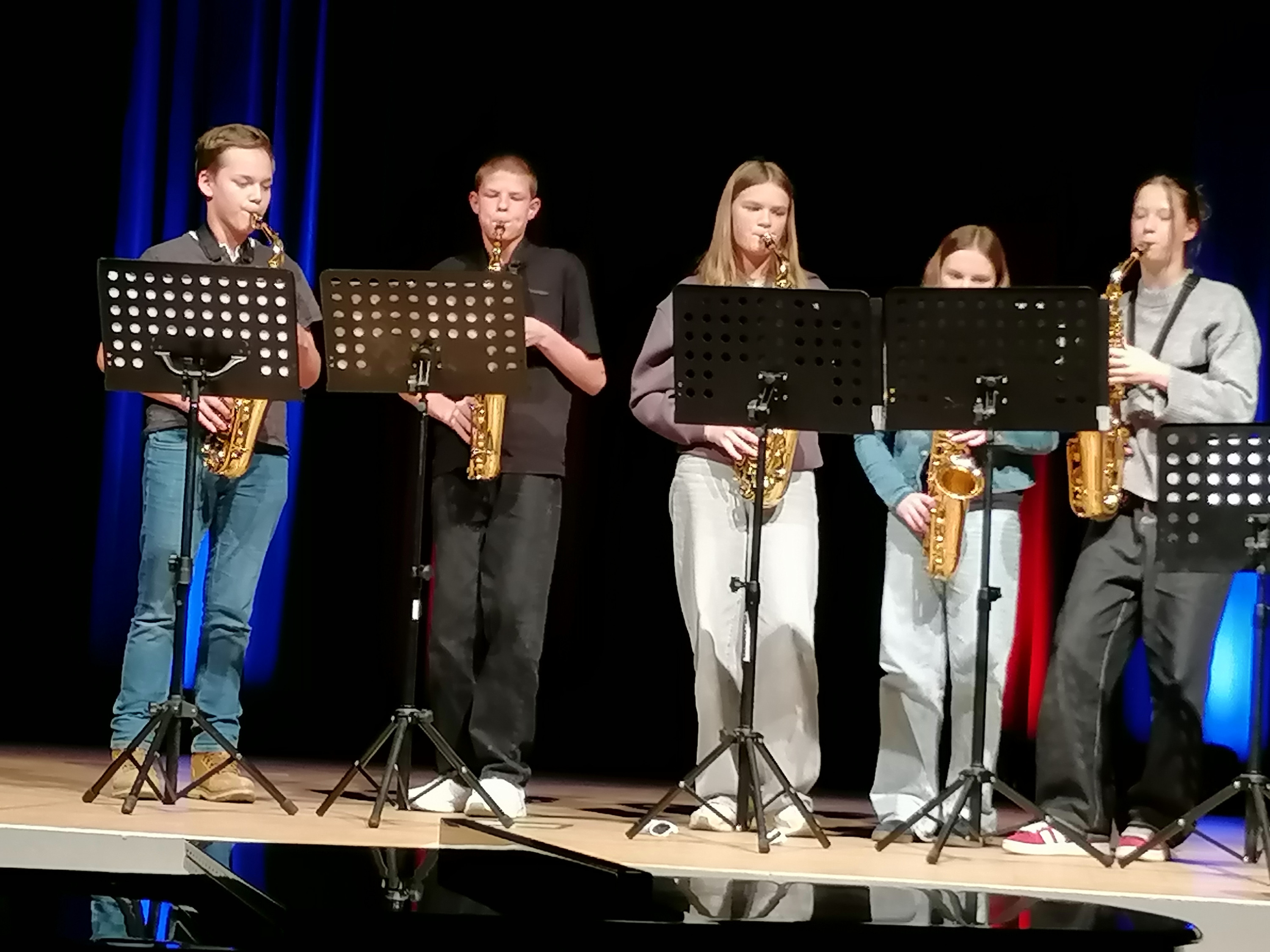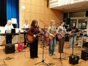 Das Saxofonensemble musizierte weihnachtliche und populäre Lieder, z.B. „Bella Napoli“ oder „Last Christmas“. Anschließend sang der Vokalpraktische Chor der Jahrgangsstufe Q1 beschwingte Lieder wie „Happy Xmas“ (John Lennon) und den Kanon „Feel the rhythm“, aber auch das zarte Weihnachtslied „Silent night“. Der Instrumentalpraktische Kurs der Q1 überzeugte die Anwesenden mit „We are the people“ oder „Merry Christmas everyone“. Neben ihrem instrumentalen Vortrag begeisterten die drei Sängerinnen der Band bei den Songs durch ihren herausragenden Gesang.